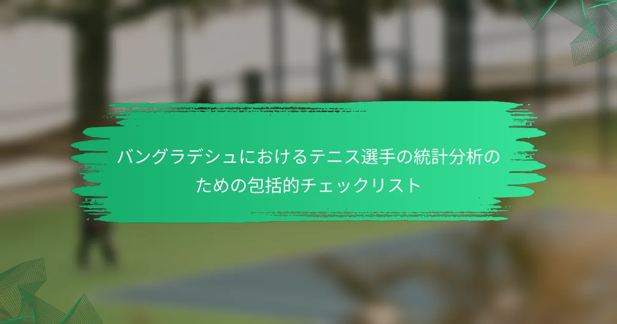 バングラデシュのテニス選手を分析するための主要な統計には、試合勝率、ランキングポイント、サーブ統計、ブレークポイント、対戦成績、怪我の履歴、選手の年齢、サーフェスパフォーマンスが含まれます。これらの指標は、選手の現在のフォーム、潜在能力、スポーツにおける全体的な競争力に関する洞察を提供します。